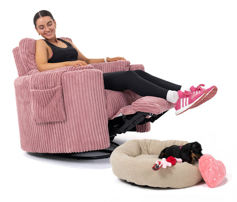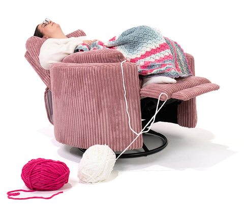 Say hello to our Fluff Mumma! Your ultimate cuddle buddy that glides (gentle rocking motion), swivels a full 360°, and reclines like a dream. The secret sauce? The handy side lever that gently reclines you into a comfortably relaxed, locked position, with the ability to push back even further to full chill mode. When you’re ready to sit up, simply use your feet to push the footrest back into place.